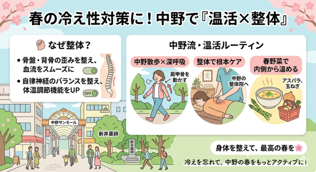 ぽかぽか陽気が増えてきた中野の街。新井薬師公園の緑も鮮やかになり、お出かけが楽しい季節ですね。しかし、この時期は「日中は暑いのに夜は冷え込む」といった気温差により、自律神経の乱れからくる「春の冷え」に悩む方が少なくありません。